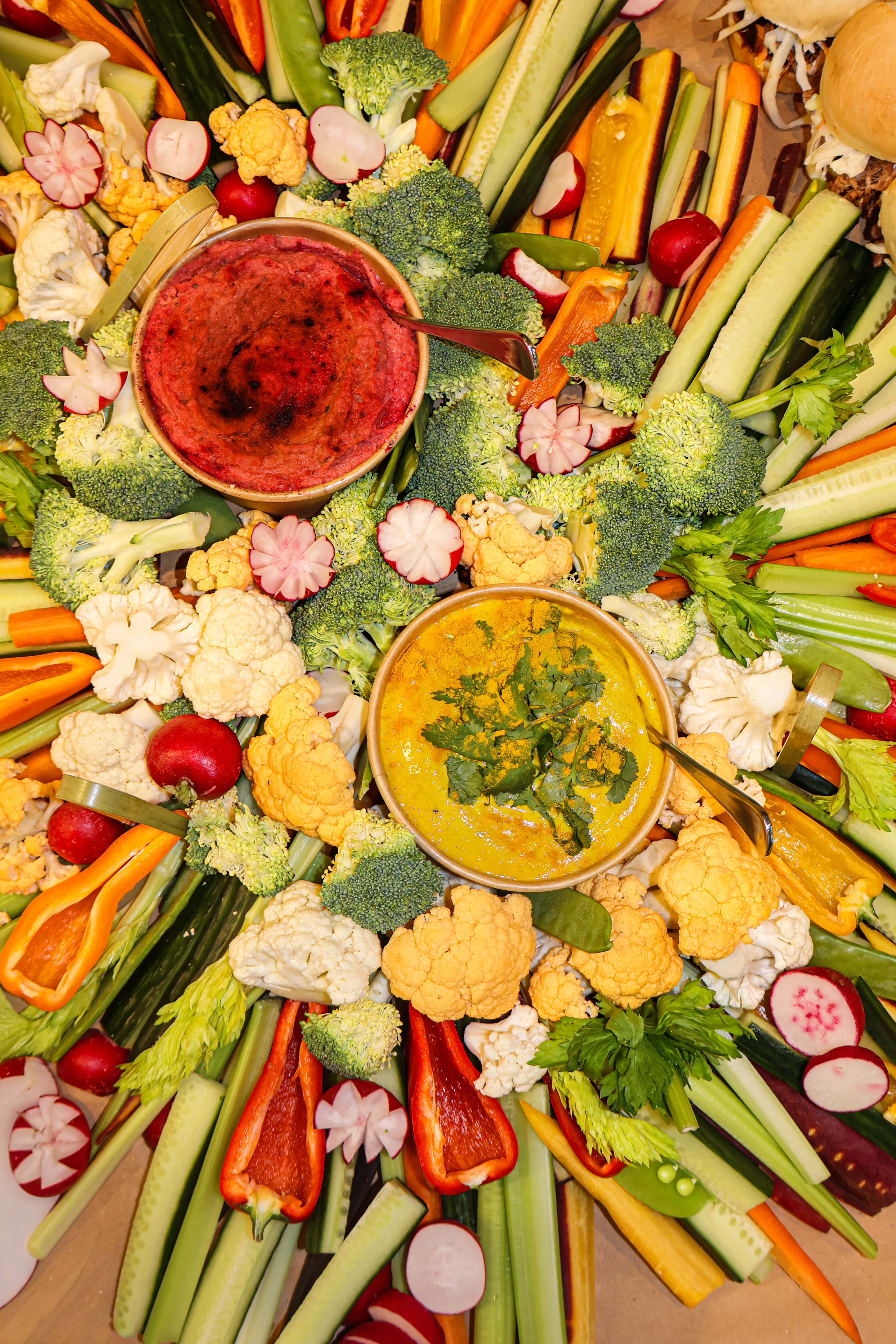 - Une sélection de crudités fraîches accompagnées d’un hummus de betterave et d’une trempette au cari et curcuma